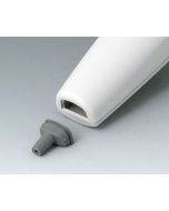 Ergonomic plastic enclosure for single-handed operation. Recessed control panel for operating elements or display modules. Fastening pillars for PCBs in the top part. Space for 9 V flat battery or battery compartment 2 x AA (accessory). Cable strain relief (acc.) alternatively applicable.